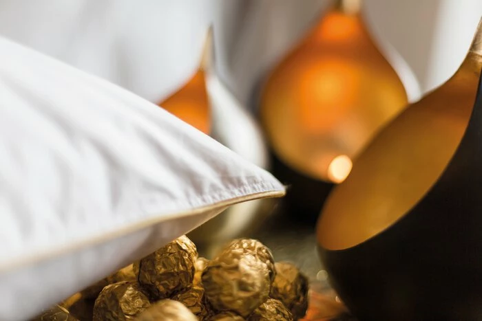 - Bezug aus feiner Mako-Einschütte mit Goldbiese (100% Baumwolle)