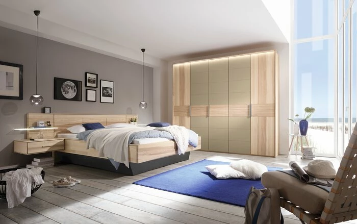 - Bettanlage besteht aus Bett 180 x 200 cm, 2x Nachttische und 2x Paneele inklusive Glasablage mit Beleuchtung