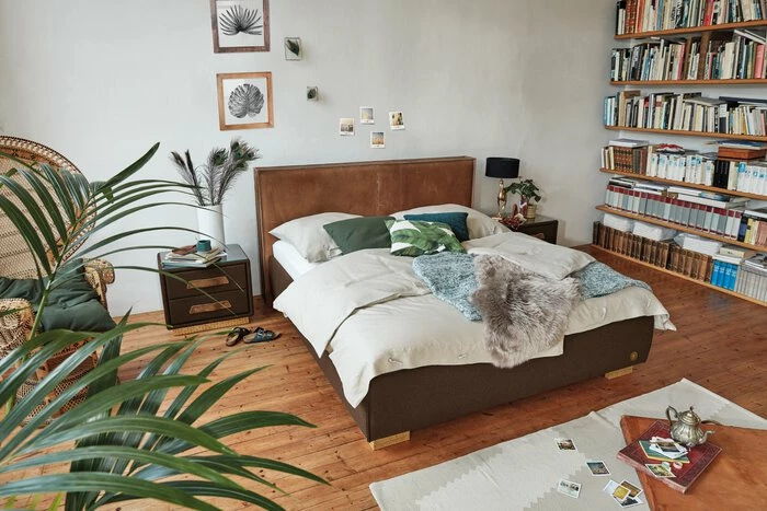 - Kopfteil aus massiver Eiche mit Sattellederbezug in braun