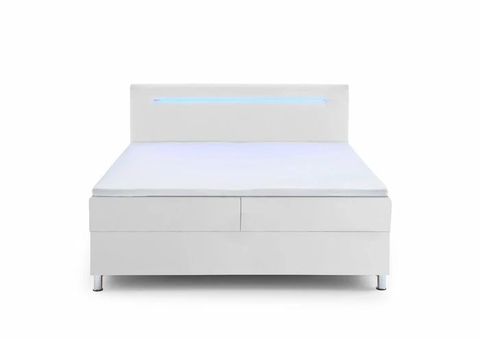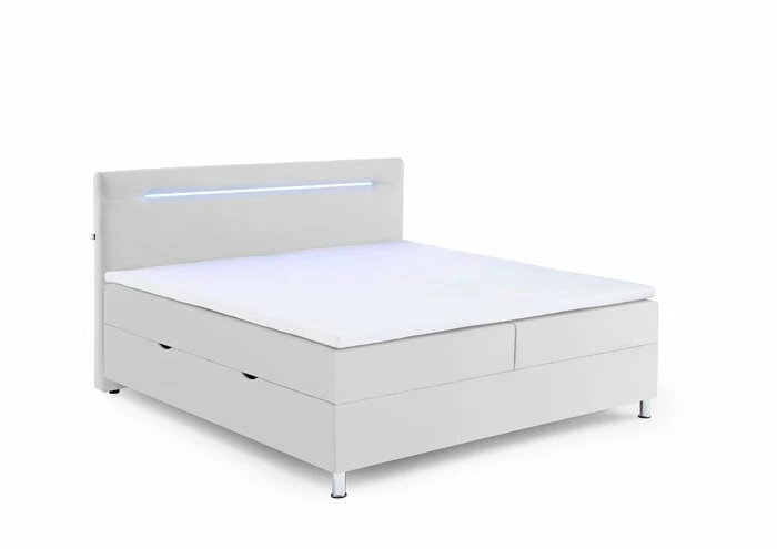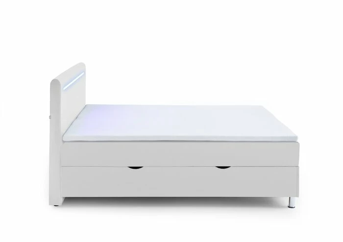 - Inkl. 2 seitlich klappbaren Bettkästen, Kopfteil inkl. LED-Beleuchtung in blau