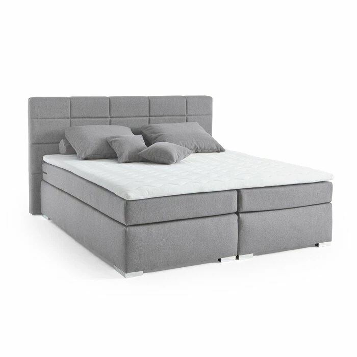 - Boxunterbau aus Holzwerkstoff (HDF) und Massivholzleisten mit 4-Gang-Bonellfederkern, bezogen in Stoff Grau