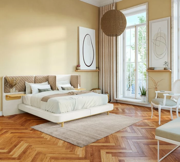 - Kopfteil „Silence“ mit Kissen in Stoffbezug Felt Sand mit Rautensteppung