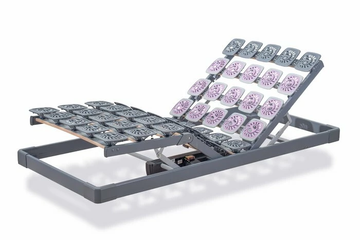 - Federelemente mit mittlerer Festigkeit im Lordose- und Beckenbereich, um die größere Belastung aufzunehmen, mit individuell fixierbarer Schulterabsenkung